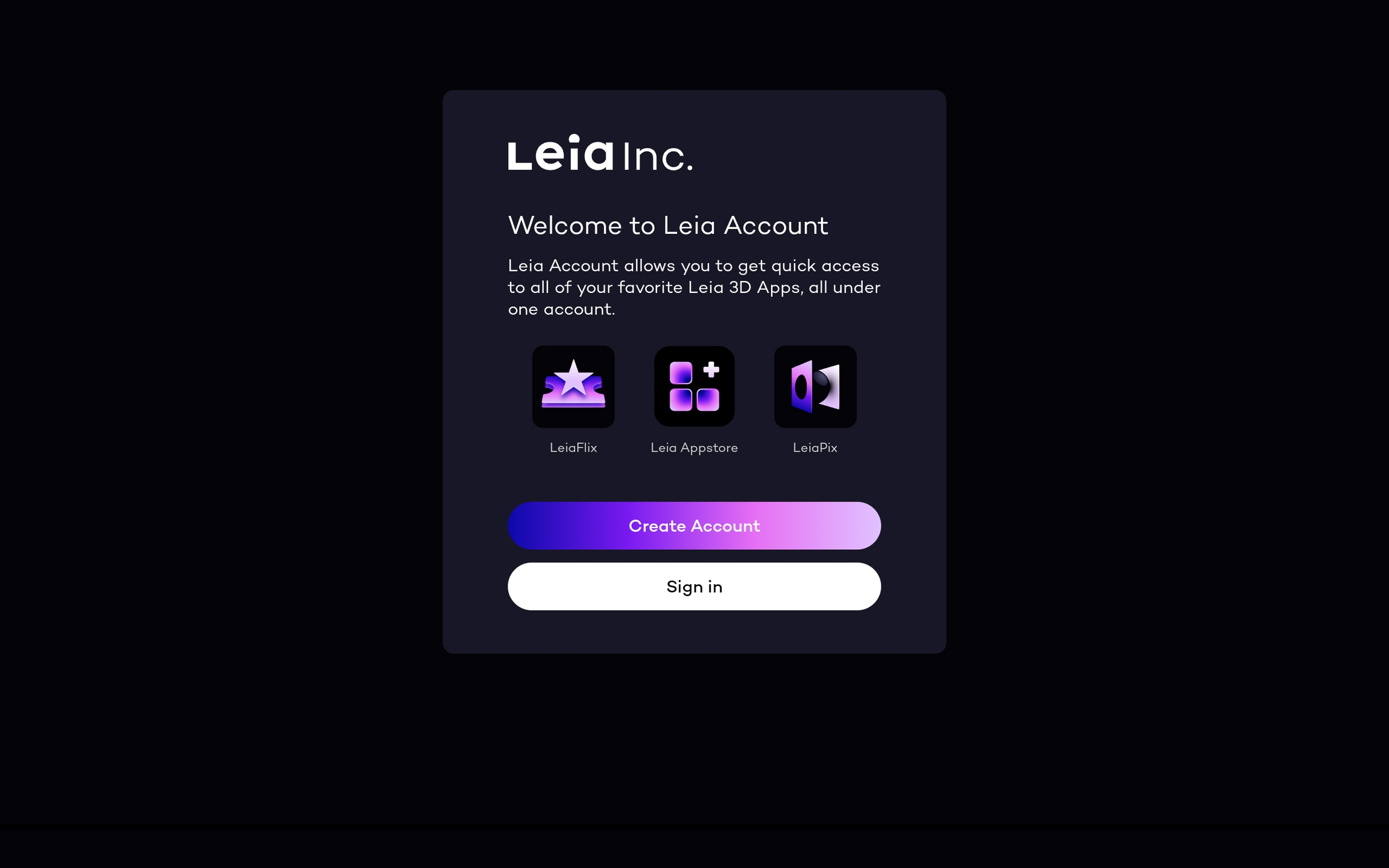 Your Leia Account provides access to a unified user account experience across Leia’s hardware and software.