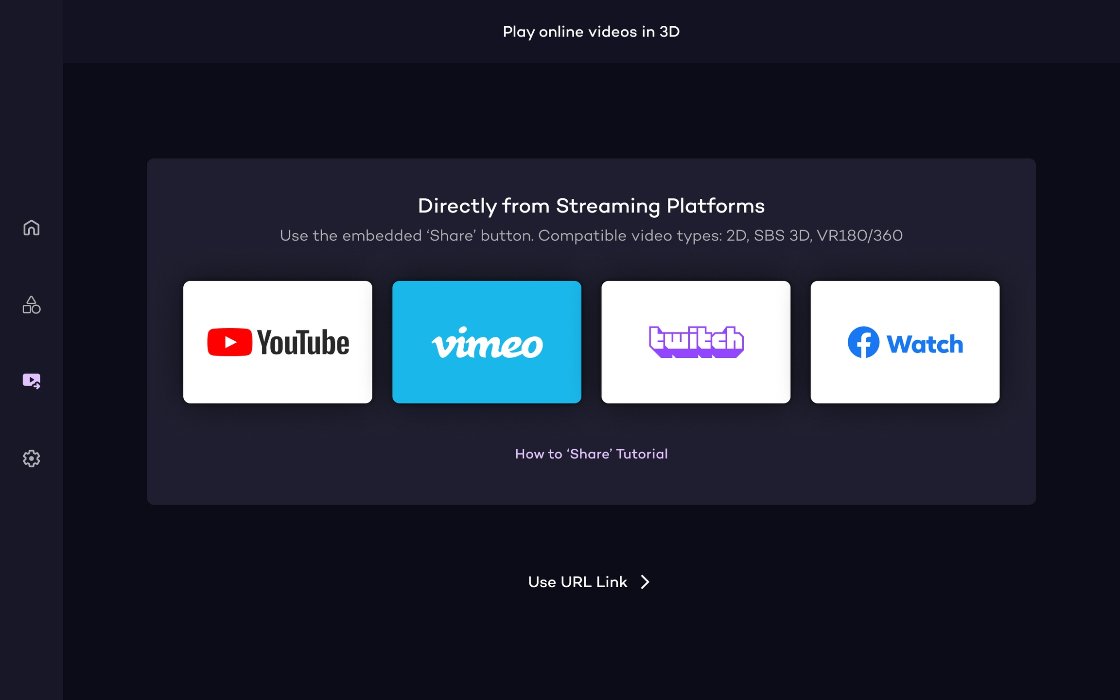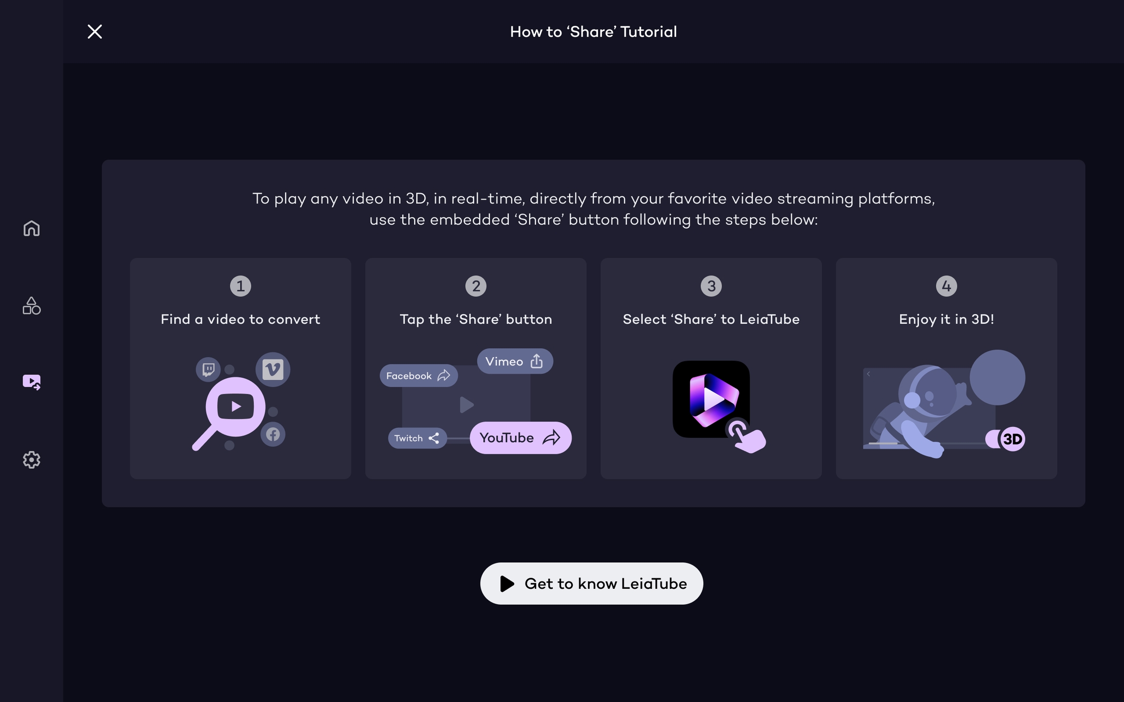 Though we highlight YouTube, Twitch, and Vimeo because they're popular platforms, you can try sharing a video from any streaming source to LeiaTube as long as the video doesn't have DRM. In many cases, it'll work great in LeiaTube! Voila, enjoy your LeiaTube experience! Note: LeiaTube's conversion feature is built-in to LeiaPlayer on Windows and does not have a standalone app experience on that platform.