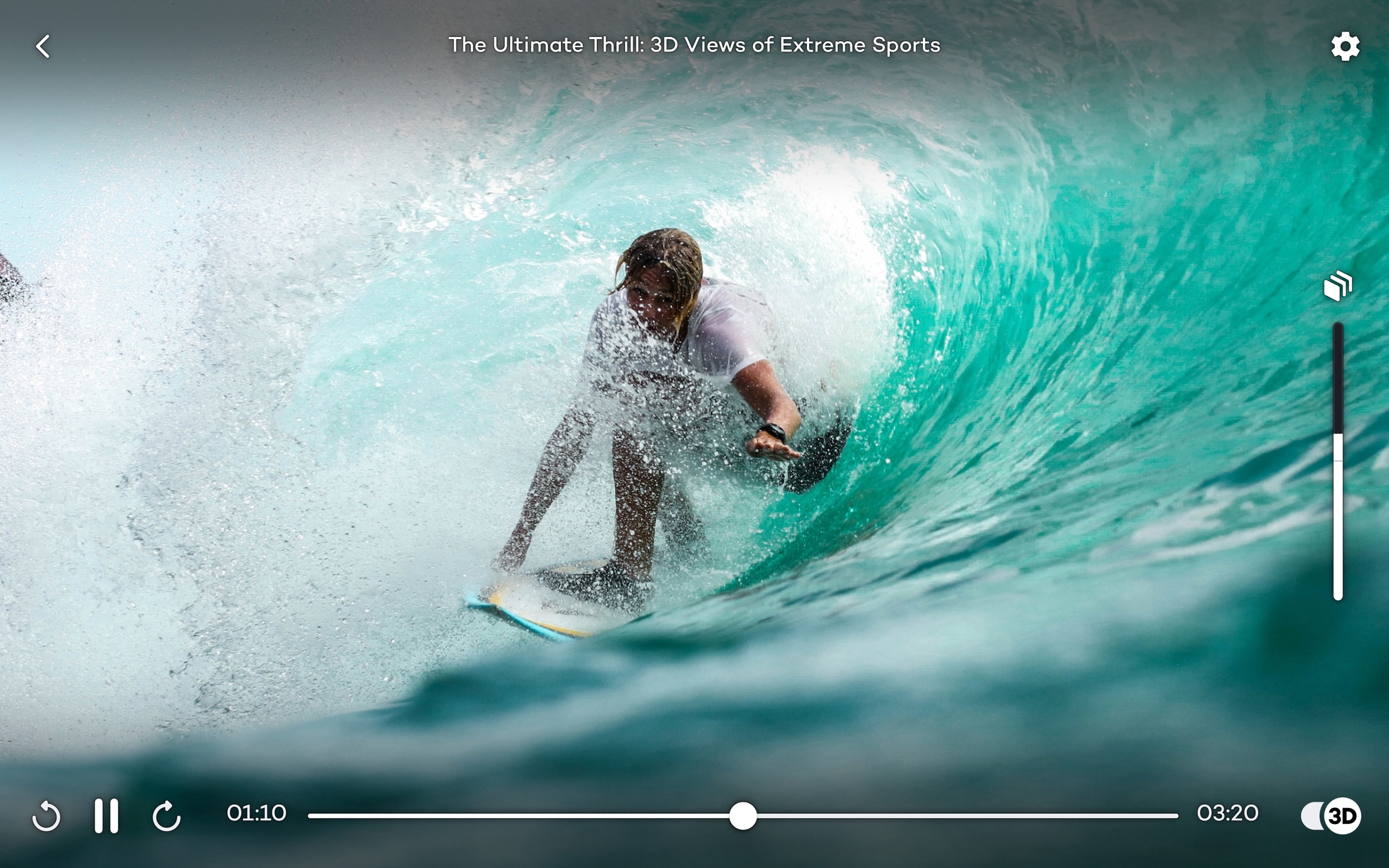 When playing content in LeiaTube, you get a pretty standard media player that's pretty self-explanatory. You have the pause and skip forward/backward options in the bottom right. You have a scrollbar at the bottom for seeking to any point in the content. You have a 2D/3D switch in the bottom right. And you have a 3D depth slider on the right hand side. LeiaTube supports 2D videos, 3D SBS videos (Half-width and Full-width), VR180 videos, 2D 360 videos, and 3D 360 videos. LeiaTube will normally identify the video automatically, but if it doesn't, you can tap the Gear icon in the top right and select the video format in the dropdown.